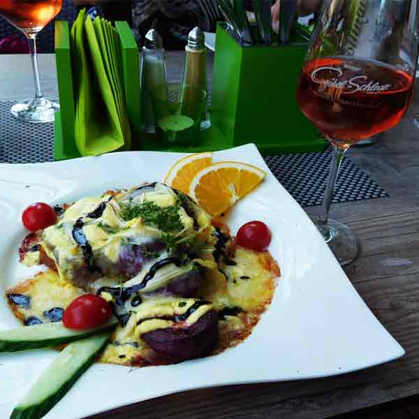 Mit Camenbert überbackene Weinbergpfirsiche und Schweinemedaillons, lecker! Dazu passt ein spritziger Rotling.